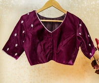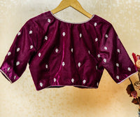 Blouse made with velvet dark purple and hand work made silver sequin, zari, zardoshi perfectly made with lining .Back open/princess cut/Elbow length sleeves with pads