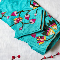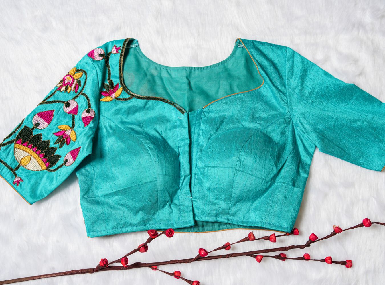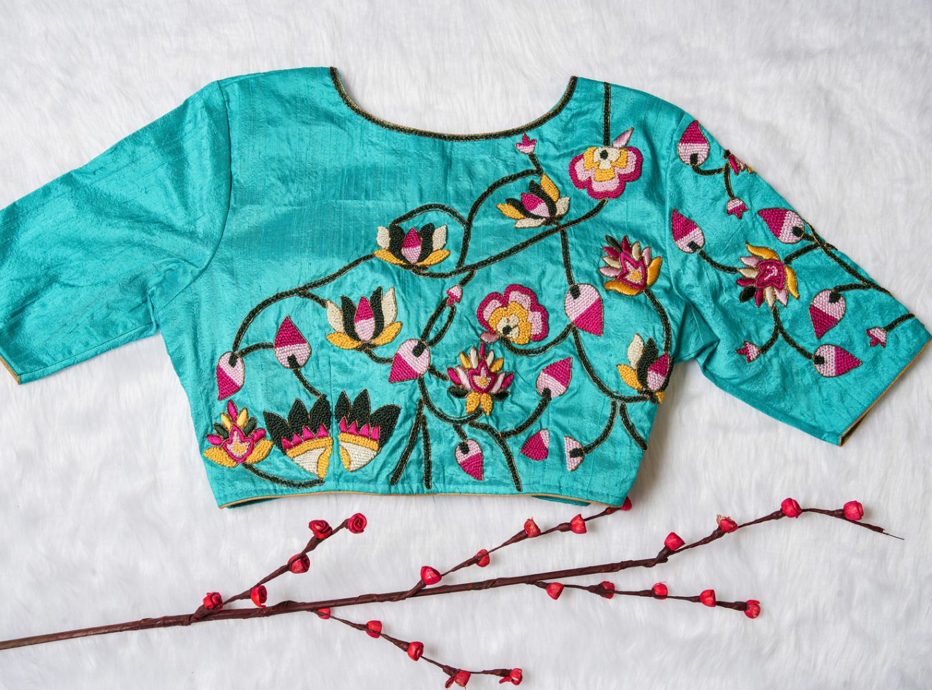 This elegant blouse is made of raw silk with a gorgeous blue hue. Hand embroidery showcases bright colors of baby pink, yellow, and bottle green, in a floral motif. It has a unique neckline in the front and back, and elbow length sleeves, with intricate lining and a front open closure. Its exclusively designed with a lotus theme and alluring thread work.