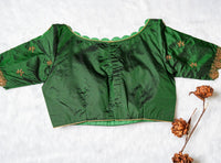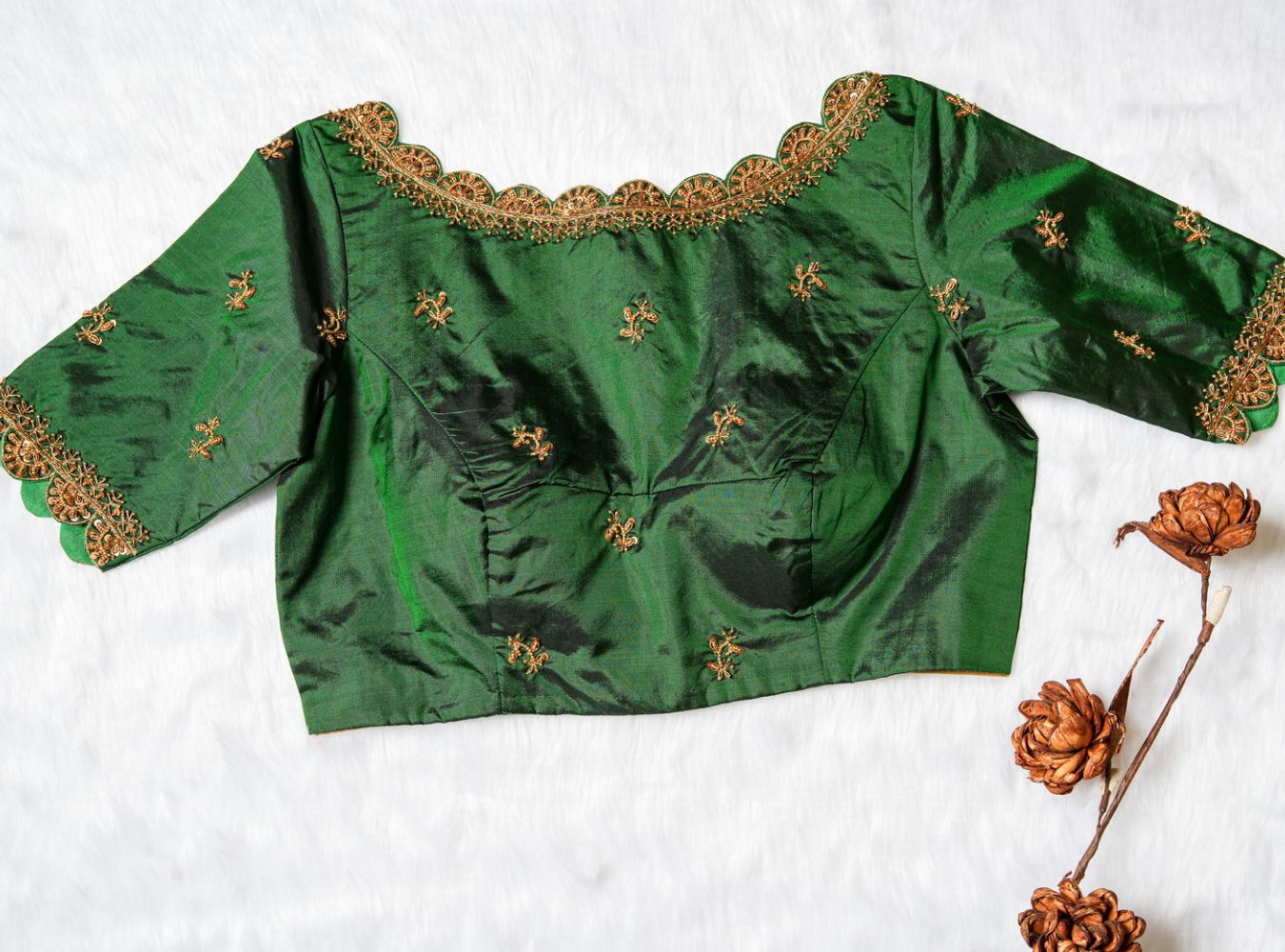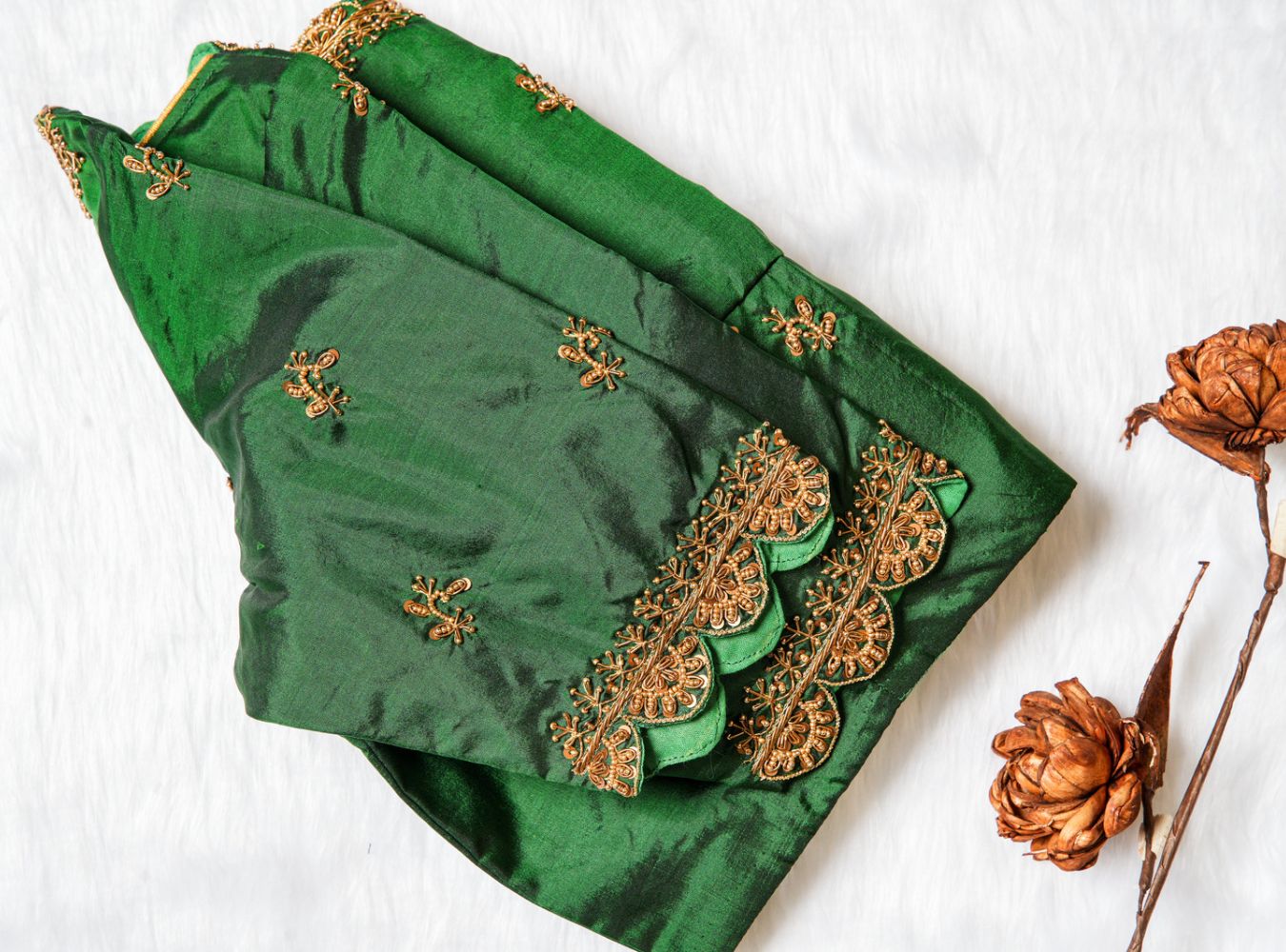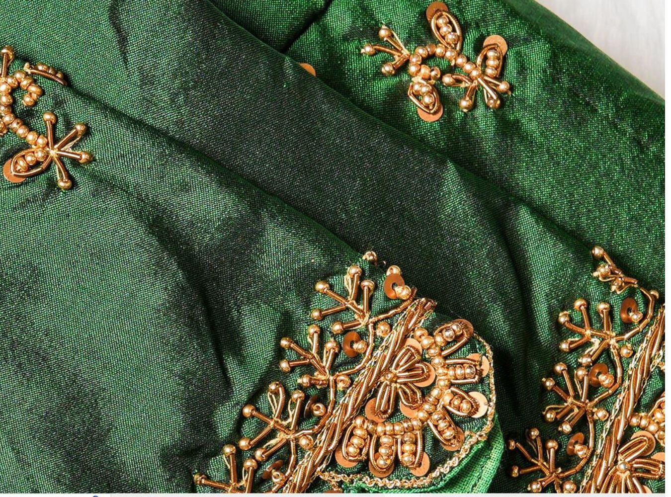 This blouse is a masterpiece. Crafted from pure silk, it features bottle green, pink, and gold beadwork, zari, zardoshi, and intricate knotting with cut work on the front and back. The neck is scalloped in the front and back with a boat neck, and it features lining and an open back in a princess cut, with elbow length sleeves, fully embellished.